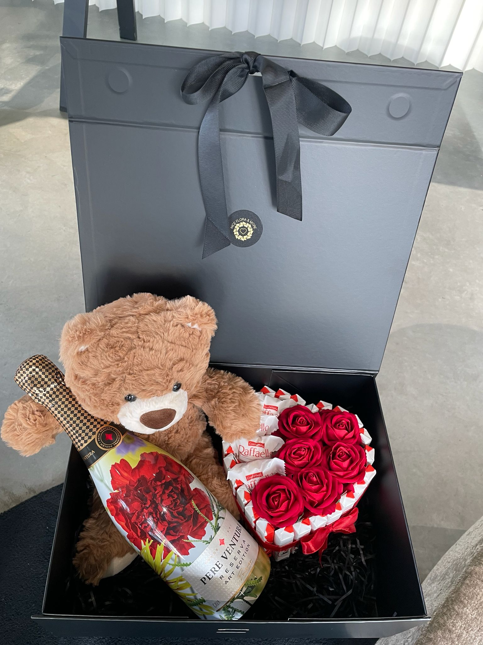 Top cava, hele zachte mooie beer, 26 kinderchocolade, 4 Raffaello’s, 6 rozen, leuk verpakt in een zwarte magnetische herbruikbare doos.